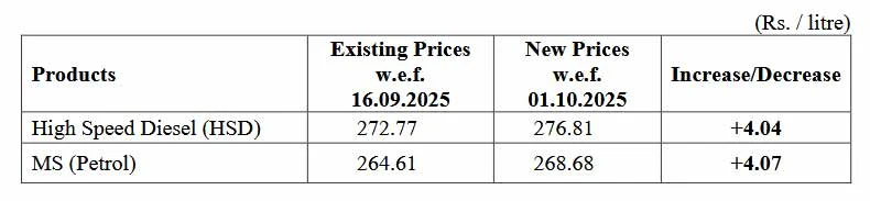 High-speed diesel has also been raised by Rs 4.04 per litre, taking the new rate to Rs 276.81 per litre. This information is confirmed in the notification that these changes are valid until the first half of October of 2025.
