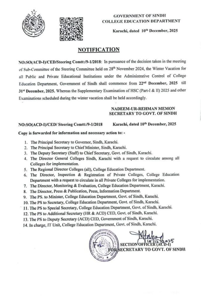 The department issued a formal notice through its Steering Committee. The decision follows meetings earlier this month to finalize the holiday schedule. The winter break 2025 Sindh covers 10 days, with 21 December being a Sunday already observed as a holiday.