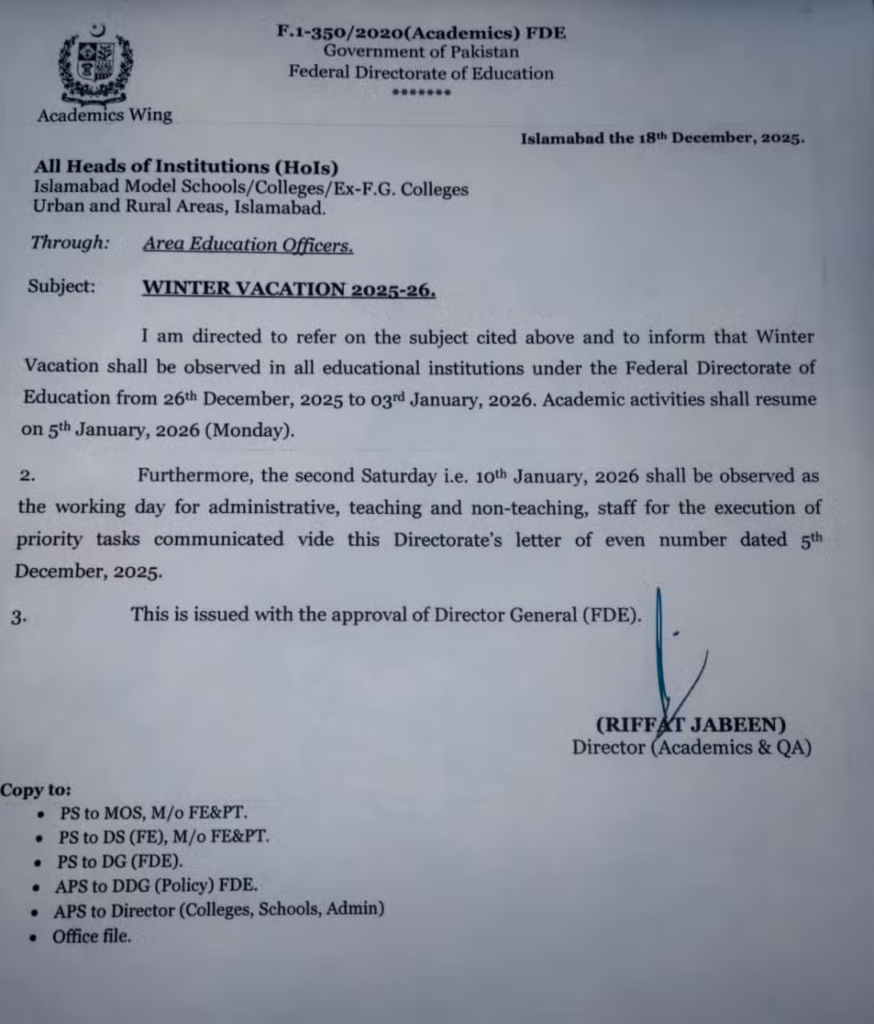 The Federal Directorate of Education (FDE) has confirmed winter vacations for all educational institutions operating under the federal system in Islamabad. According to the official notification, model schools and colleges will close from December 26 to January 3.