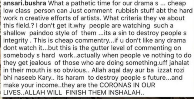 Later, Bushra Ansari lashed out at Lubna Faryad without naming her and termed these sorts of critics as Corona. She also wrote that Allah will finish them.