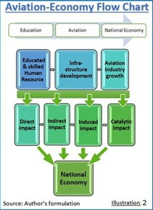 Using appropriate econometric techniques other researchers have conclusively determined that air-transport impacts national economy, and the causality is bi-directional between the two variables. Panel Data Granger tests as well as empirical studies and analyses confirm this relationship. Many authors including Percoco (2010) have sequentially categorized the effects of airport (and therefore, air-transport or aviation) as direct, indirect, induced, and catalytic impacts. A modified schematic Flow Chart representation is given below: