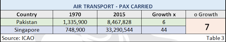 If passengers carried is proxied as a benchmark for aviation growth, in 1970, Singapore had only 0.75 million passengers enplaned, while Pakistan had almost double the traffic (1.34 million passengers) in the same year. In 45 years (up until 2015), Singapore, by paying serious attention and importance to aviation, grew by 44 times its 1970 level, a growth unprecedented in the region. In comparison, in the same time frame, Pakistan grew by only six times its volume in 45 years. Table 3 gives the extracted data from ICAO that reveals that the comparison of growth profile of Singapore is 7 times that of Pakistan. This is how aviation?s infrastructure development by Singapore contributed to growth of its nation.