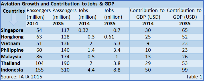 As can be seen in the Table 1 below, according to IATA 2015 report, Singapore leads all other countries in the region and excels in the projections in terms of passenger traffic, employment rate (jobs) and contribution to GDP.
