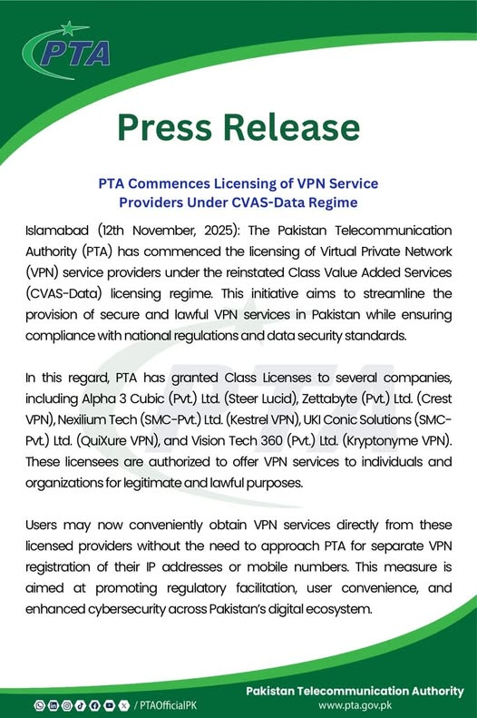 On November 13, 2025, PTA published a list of the first licensed VPN providers. The list includes: