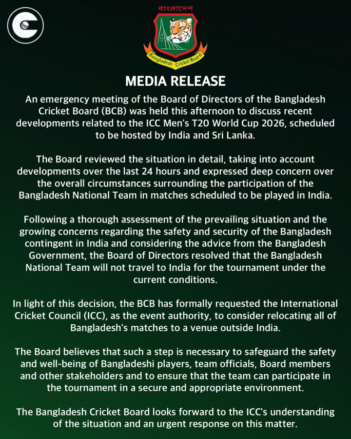 The Bangladesh Cricket Board (BCB) officially informed the ICC on January 4, 2026, that its national team will not travel to India for the T20 World Cup 2026. Citing severe security concerns, the board requested to move all group matches to Sri Lanka. This decision follows a diplomatic row after the BCCI forced Kolkata Knight Riders to release pacer Mustafizur Rahman from his IPL contract.