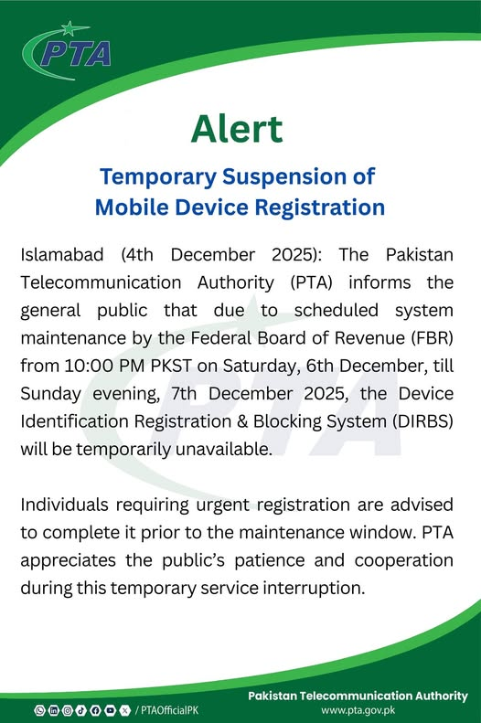 The suspension follows scheduled maintenance coordinated with the Federal Board of Revenue (FBR). PTA urged users with new or imported mobile devices to complete PTA mobile registration before the maintenance begins.
