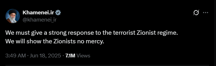 Iranian Supreme Leader Ali Khamenei stated that Iran must give a strong response to the “terrorist Zionist regime” and declared that “we will show the Zionists no mercy.” The statement was posted in English on his official X (formerly Twitter) account, followed by more tweets in Farsi and Hebrew.